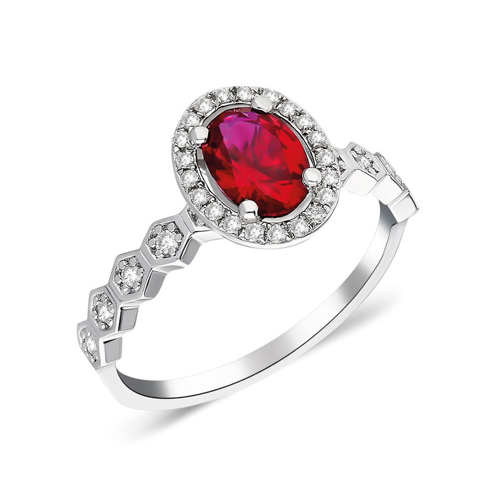 Crimsona captures the depth and intensity of a vivid ruby, framed by a refined diamond halo that amplifies its natural fire. The oval-cut ruby sits confidently at the center, surrounded by round diamonds that add brilliance without overpowering the stone’s rich character.